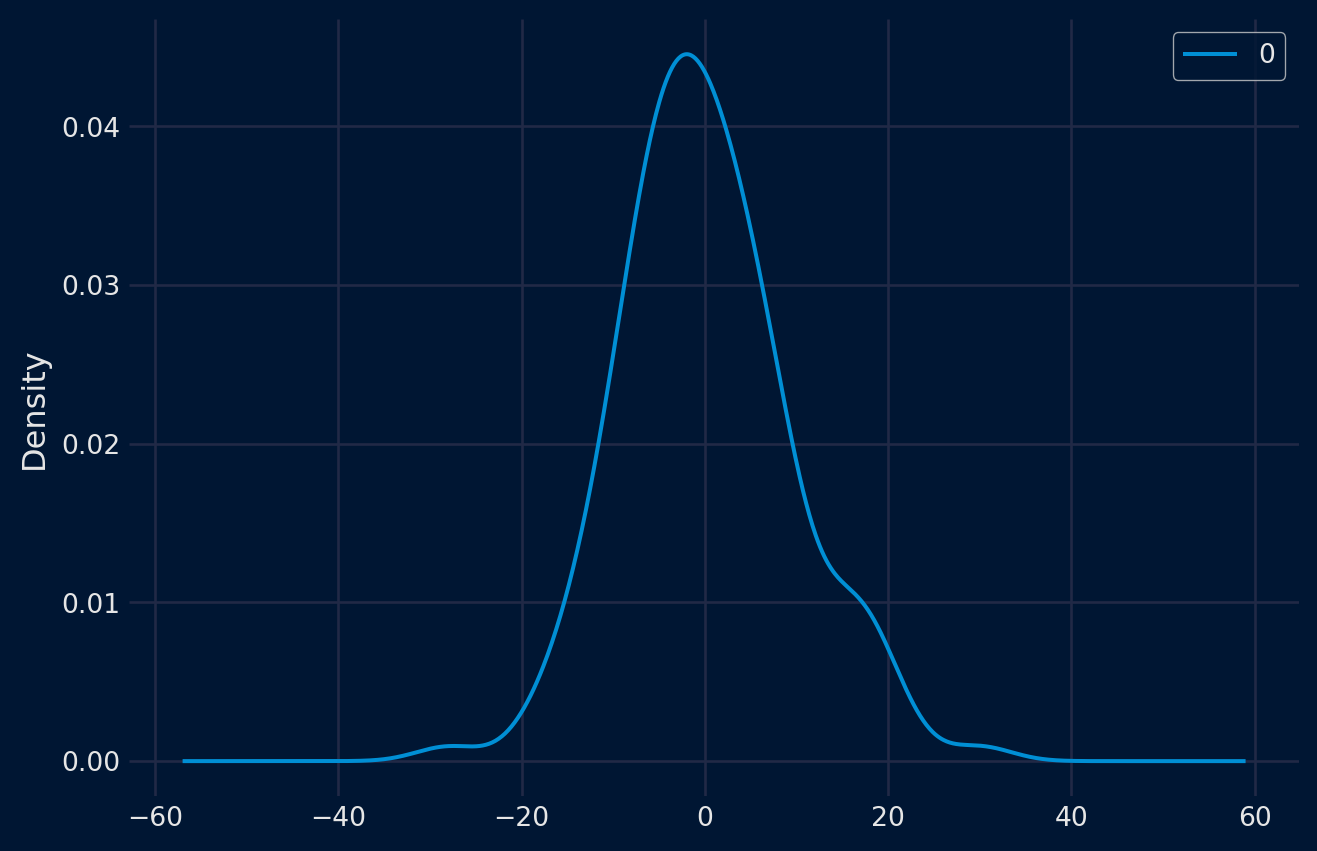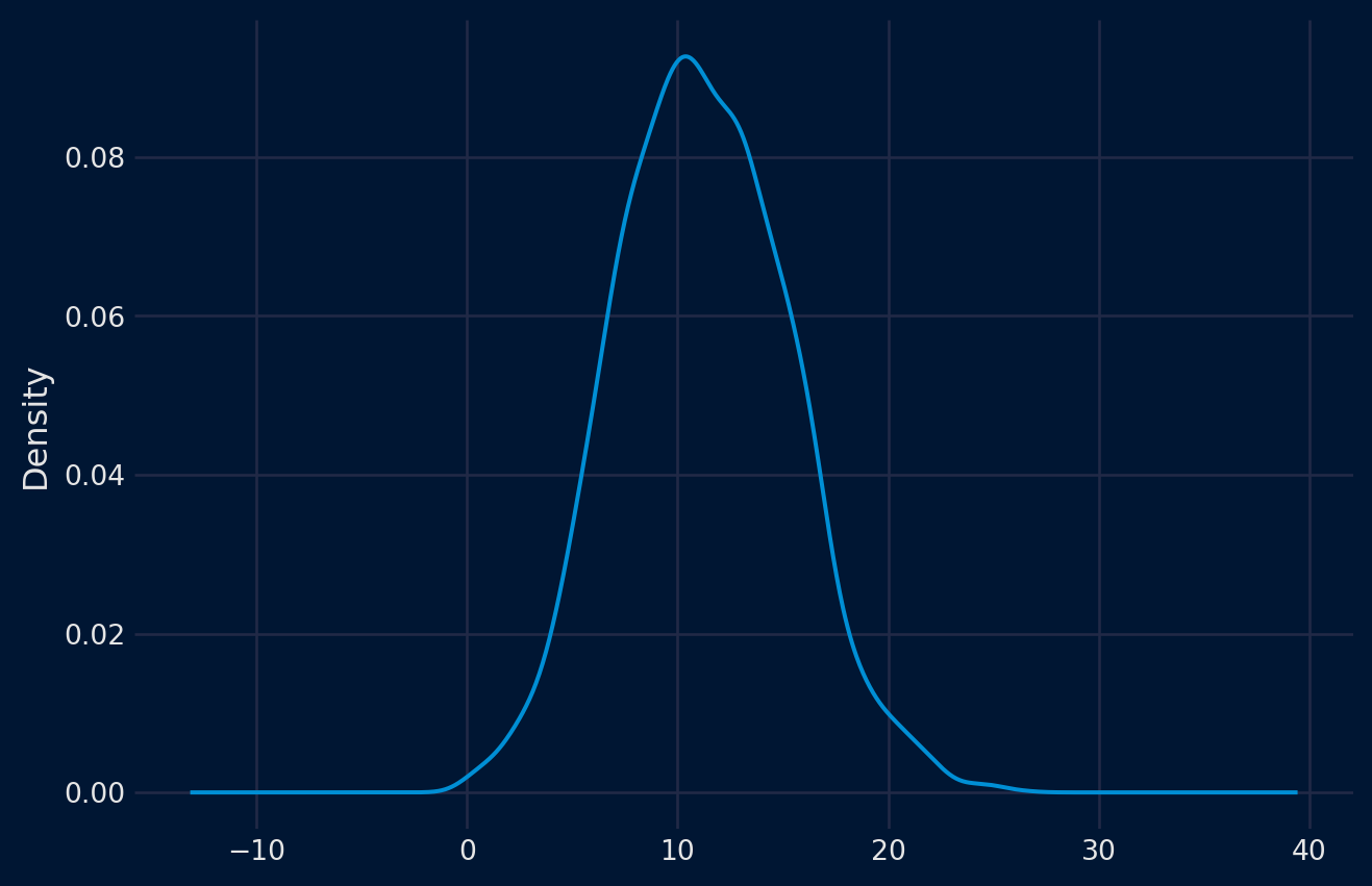# create a density plotfrom pandas import read_csvfrom matplotlib import pyplotseries = read_csv('daily-min-temperatures (1).csv', header=0, index_col=0,parse_dates=True).squeeze("columns")series.plot(kind='kde')pyplot.show()pyplot.close()
