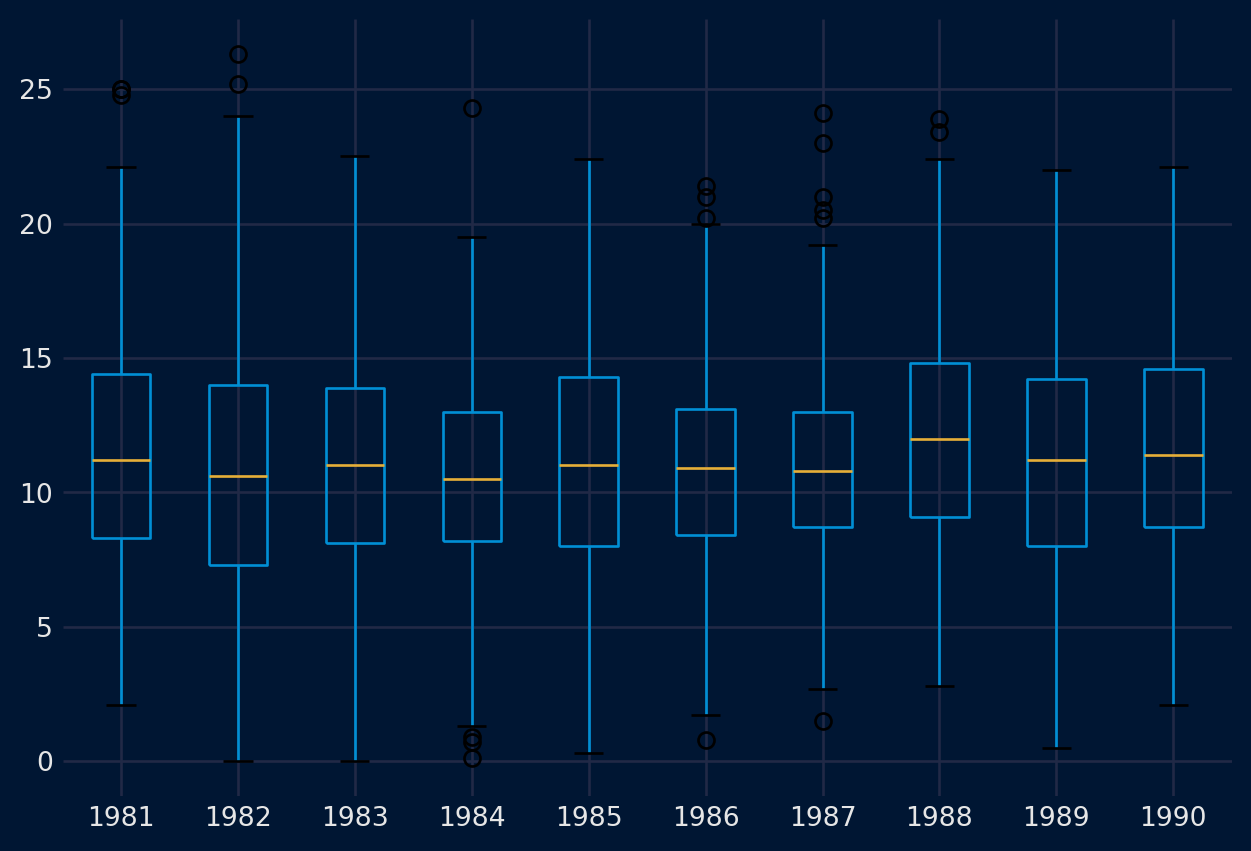 # create a boxplot of yearly datafrom pandas import read_csvfrom pandas import DataFramefrom pandas import Grouperfrom matplotlib import pyplotseries = read_csv('daily-min-temperatures (1).csv', header=0, index_col=0,parse_dates=True).squeeze("columns")groups = series.groupby(Grouper(freq='Y'))years = DataFrame()for name, group in groups: years[name.year] = group.valuesyears.boxplot()pyplot.show()pyplot.close()