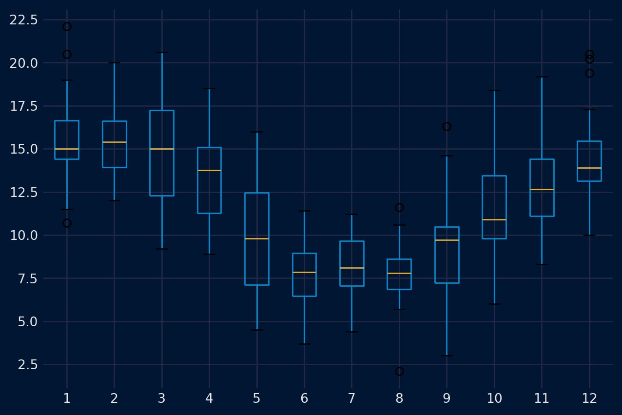 # create a boxplot of monthly datafrom pandas import read_csvfrom pandas import DataFramefrom pandas import Grouperfrom matplotlib import pyplotfrom pandas import concatseries = read_csv('daily-min-temperatures (1).csv', header=0, index_col=0,parse_dates=True).squeeze("columns")one_year = series['1990']groups = one_year.groupby(Grouper(freq='M'))months = concat([DataFrame(x[1].values) for x in groups], axis=1)months = DataFrame(months)months.columns =range(1,13)months.boxplot()pyplot.show()pyplot.close()