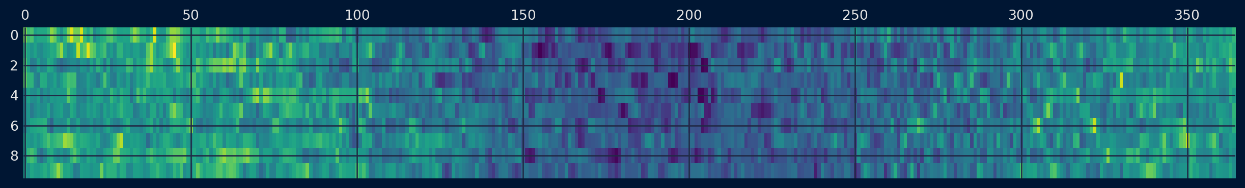 # create a heat map of yearly datafrom pandas import read_csvfrom pandas import DataFramefrom pandas import Grouperfrom matplotlib import pyplotseries = read_csv('daily-min-temperatures (1).csv', header=0, index_col=0,parse_dates=True).squeeze("columns")groups = series.groupby(Grouper(freq='Y'))years = DataFrame()for name, group in groups: years[name.year] = group.valuesyears = years.Tpyplot.matshow(years, interpolation=None, aspect='auto')pyplot.show()pyplot.close()