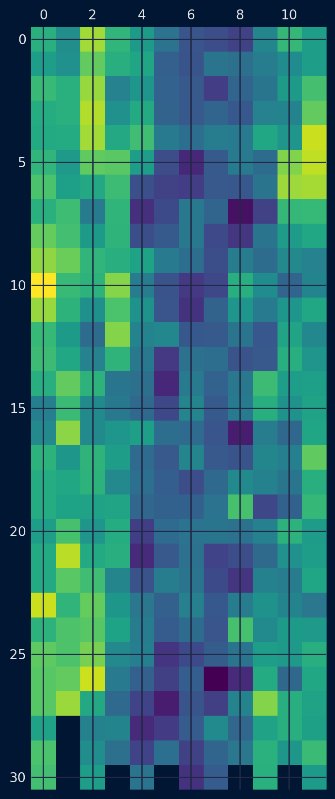 # create a heat map of monthly datafrom pandas import read_csvfrom pandas import DataFramefrom pandas import Grouperfrom matplotlib import pyplotfrom pandas import concatseries = read_csv('daily-min-temperatures (1).csv', header=0, index_col=0,parse_dates=True).squeeze("columns")one_year = series['1990']groups = one_year.groupby(Grouper(freq='M'))months = concat([DataFrame(x[1].values) for x in groups], axis=1)months = DataFrame(months)months.columns =range(1,13)pyplot.matshow(months, interpolation=None, aspect='auto')pyplot.show()pyplot.close()
