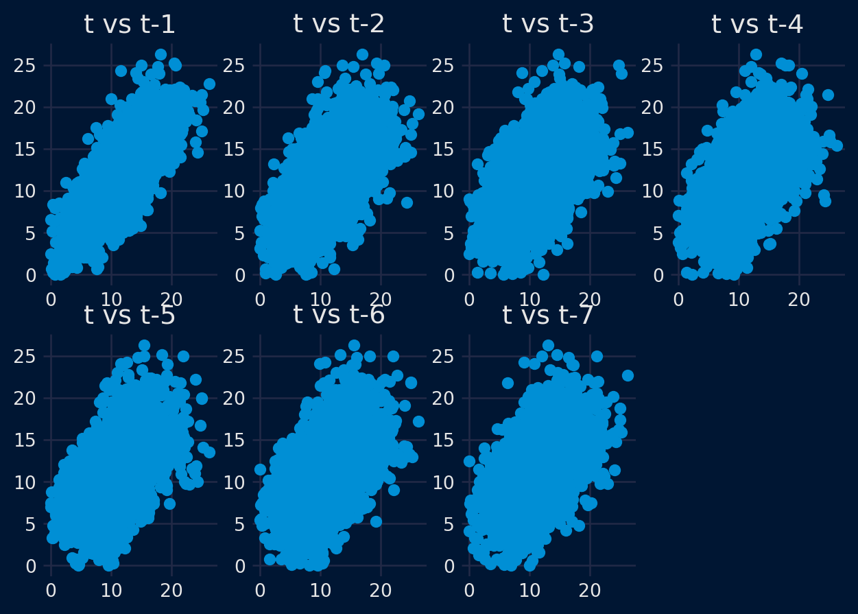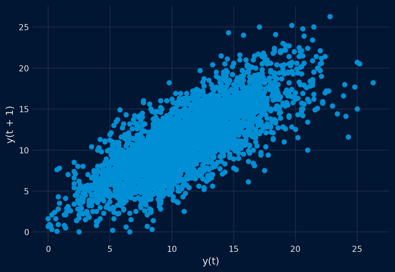 La modelización de series temporales presupone una relación entre una observación y la observación anterior. Las observaciones anteriores en una serie temporal se denominan retardos, con la observación en el paso de tiempo anterior denominada lag1, la observación en dos pasos de tiempo hace lag=2, y así sucesivamente. Un tipo de gráfico útil para explorar la relación entre cada observación y un retardo de esa observación se llama gráfico de dispersión. Pandas tiene una función incorporada para exactamente esto llamado el gráfico de retardo. Se traza la observación en el tiempo t en el eje x y la observación en el siguiente paso de tiempo (t + 1) en el eje y.