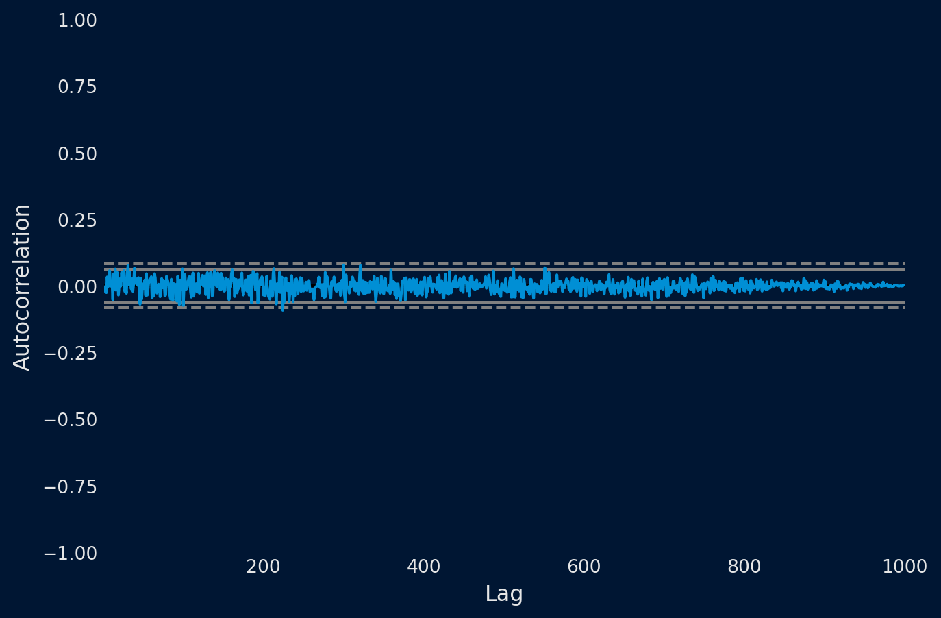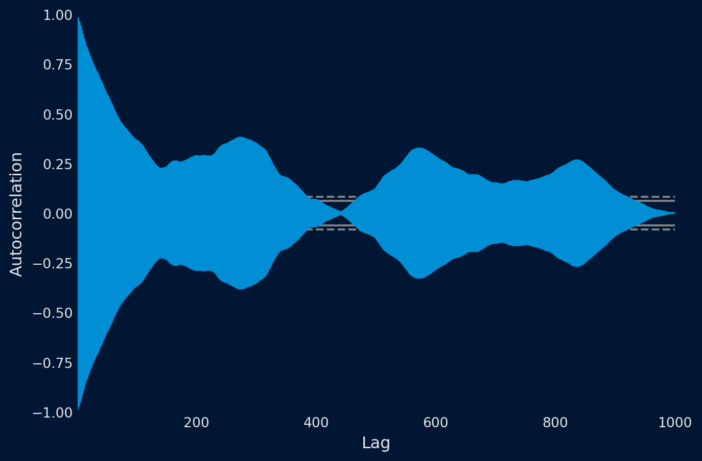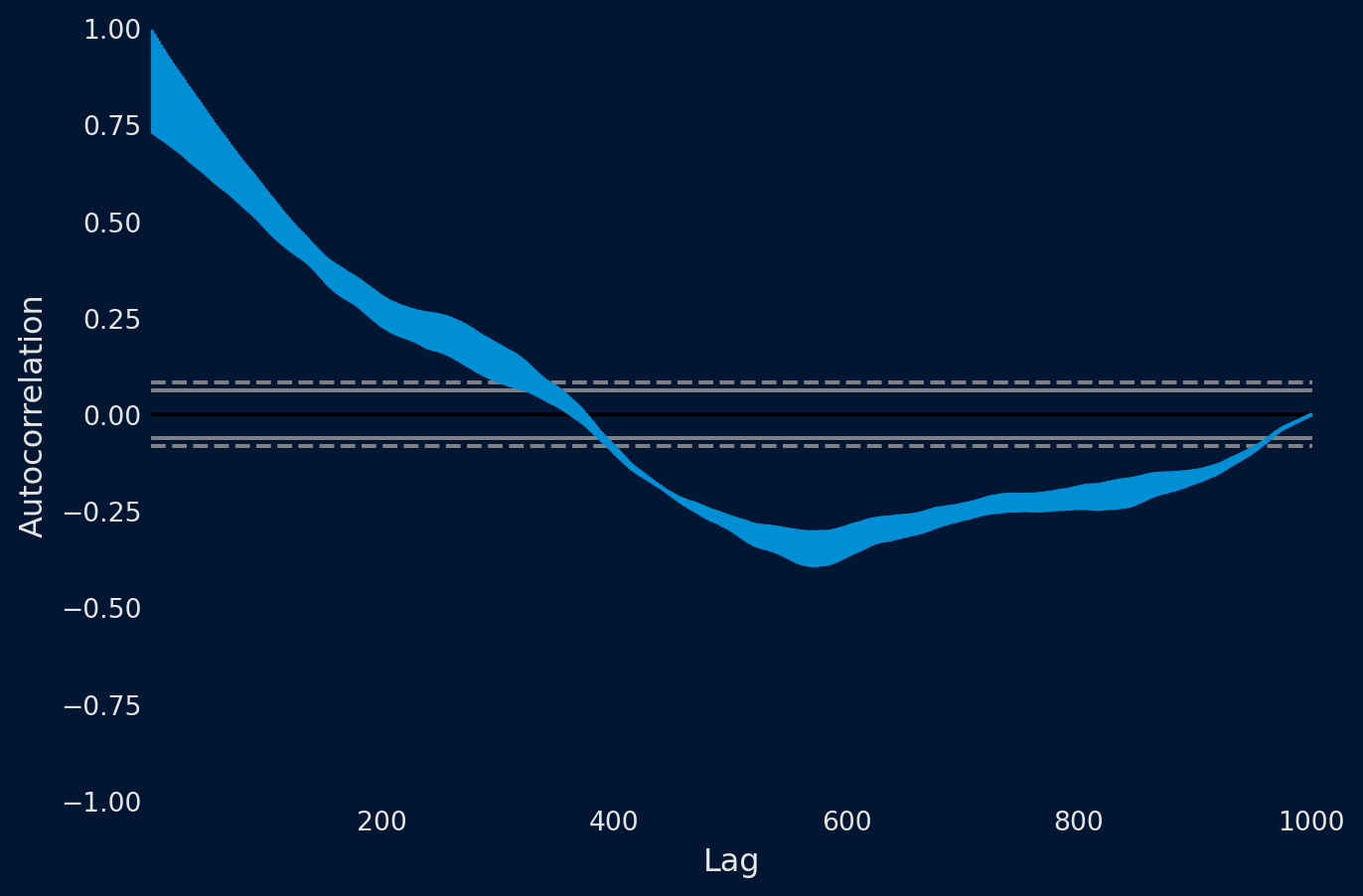 Podemos cuantificar la fuerza y el tipo de relación entre las observaciones y sus retardos. En estadística, esto se denomina correlación y, cuando se calcula en función de los valores de retardo de las series temporales, se denomina autocorrelación. Un valor de correlación calculado entre dos grupos de números, como las observaciones y sus valores de retardo = 1, da como resultado un número comprendido entre -1 y 1. El signo de este número indica una correlación negativa o positiva, respectivamente. Un valor cercano a cero indica una correlación débil, mientras que un valor cercano a -1 o 1 indica una correlación fuerte.