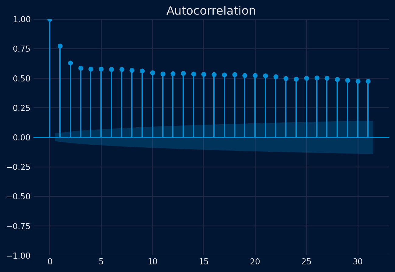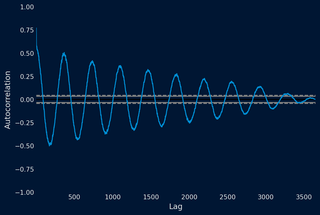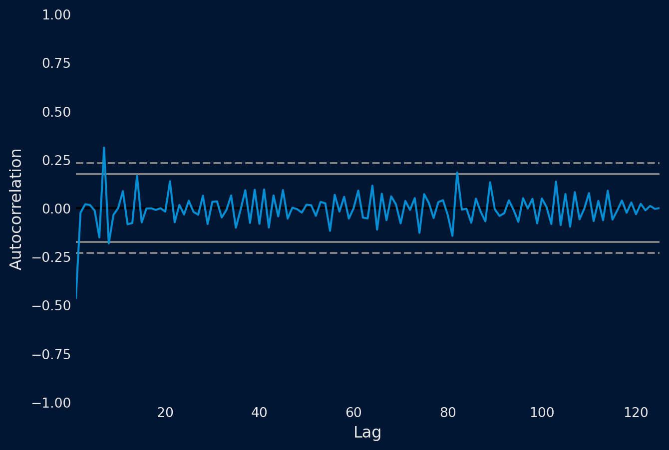 Podemos cuantificar la fuerza y el tipo de relación entre las observaciones y sus retardos. En estadística, esto se denomina correlación y, cuando se calcula en función de los valores de retardo de las series temporales, se denomina autocorrelación. Un valor de correlación calculado entre dos grupos de números, como las observaciones y sus valores de retardo = 1, da como resultado un número comprendido entre -1 y 1. El signo de este número indica una correlación negativa o positiva, respectivamente. Un valor cercano a cero indica una correlación débil, mientras que un valor cercano a -1 o 1 indica una correlación fuerte.