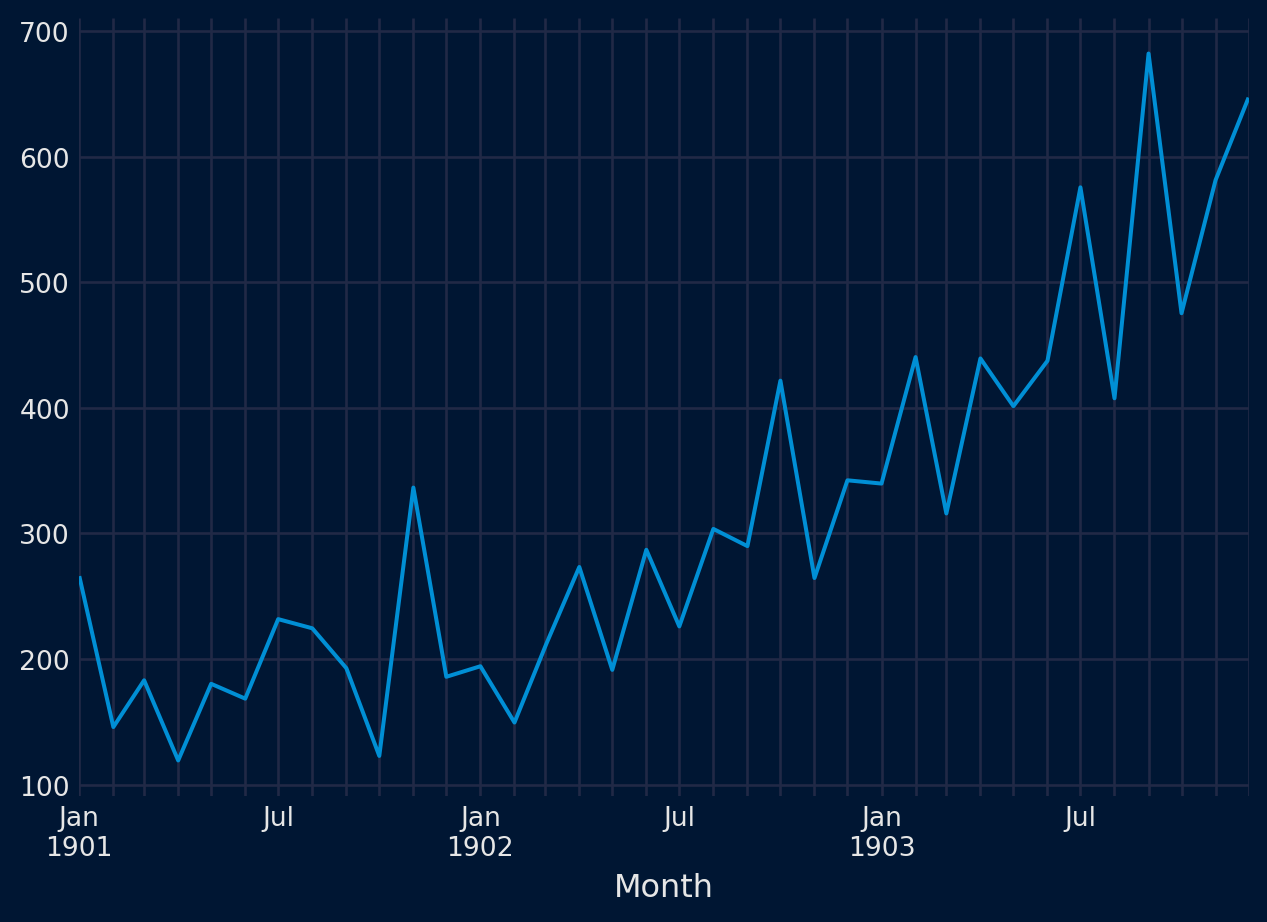 En esta lección, utilizaremos como ejemplo el conjunto de datos Ventas de champú. Este conjunto de datos describe el número mensual de ventas de champú durante un periodo de 3 años.