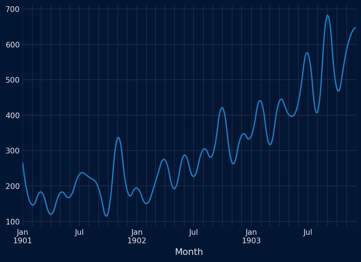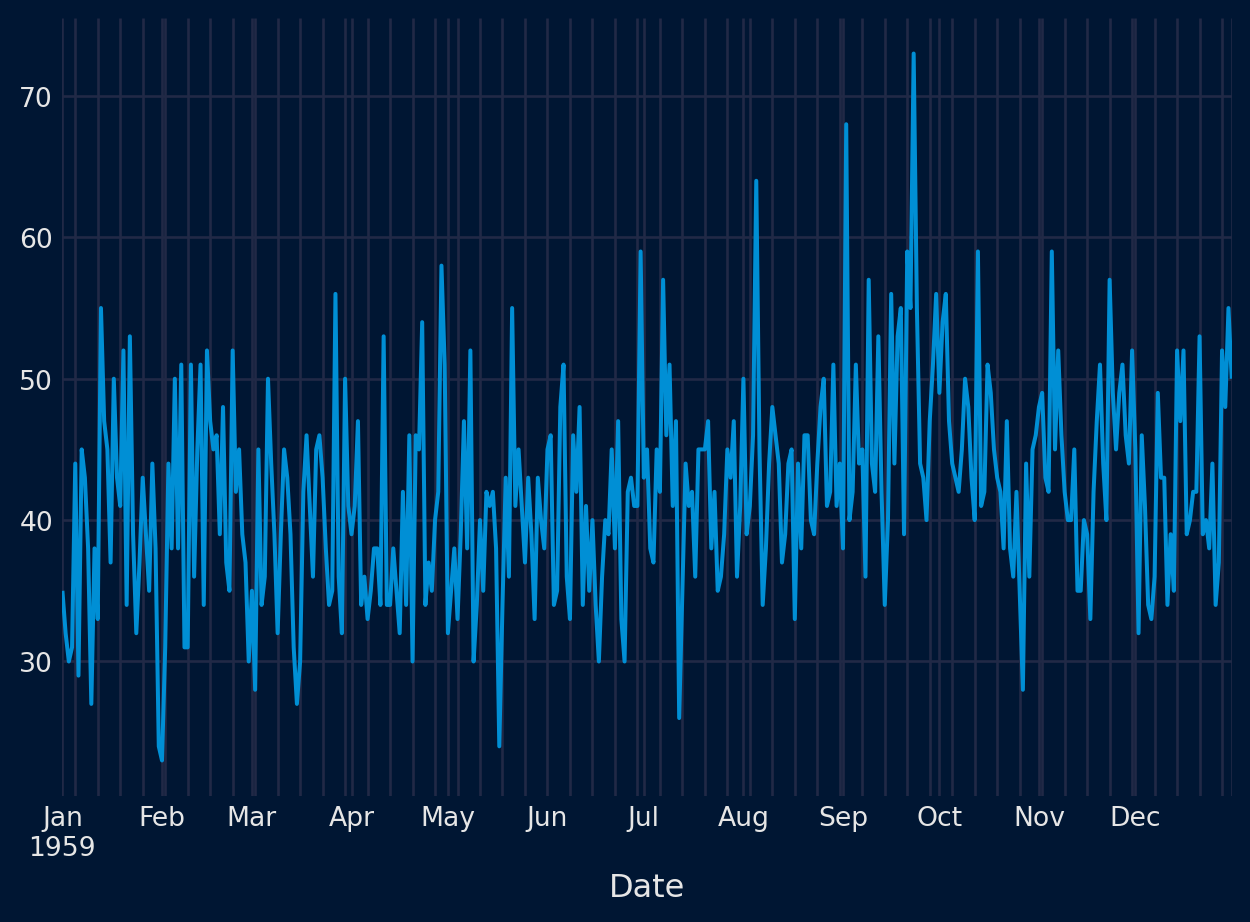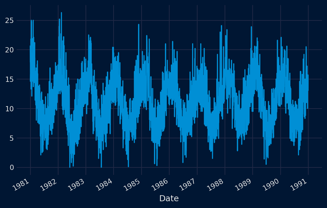 # create a line plotfrom pandas import read_csvfrom matplotlib import pyplotfrom skforecast.plot import set_dark_themeseries = read_csv('daily-min-temperatures (1).csv', header=0, index_col=0,parse_dates=True).squeeze("columns")set_dark_theme()series.plot()pyplot.show()