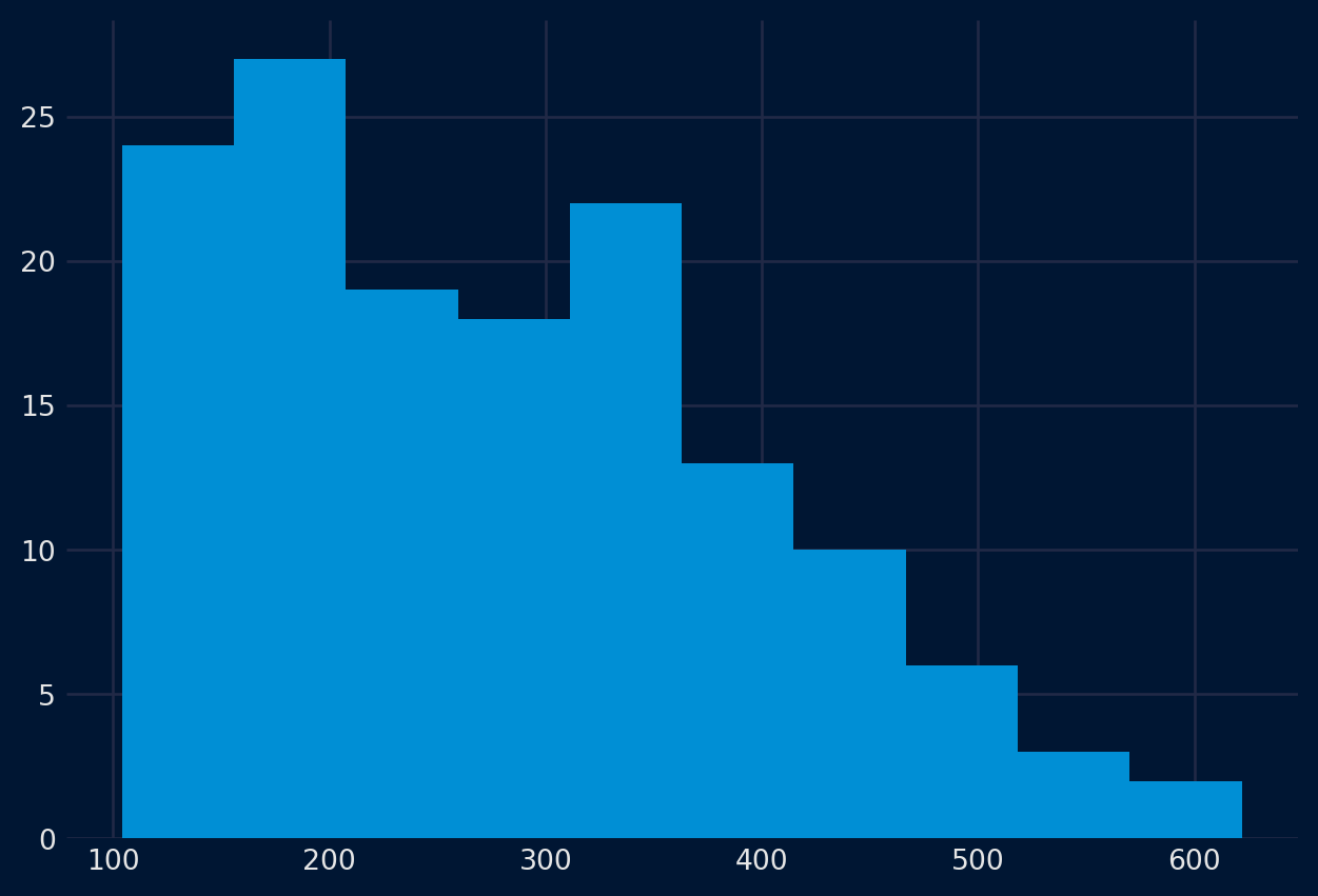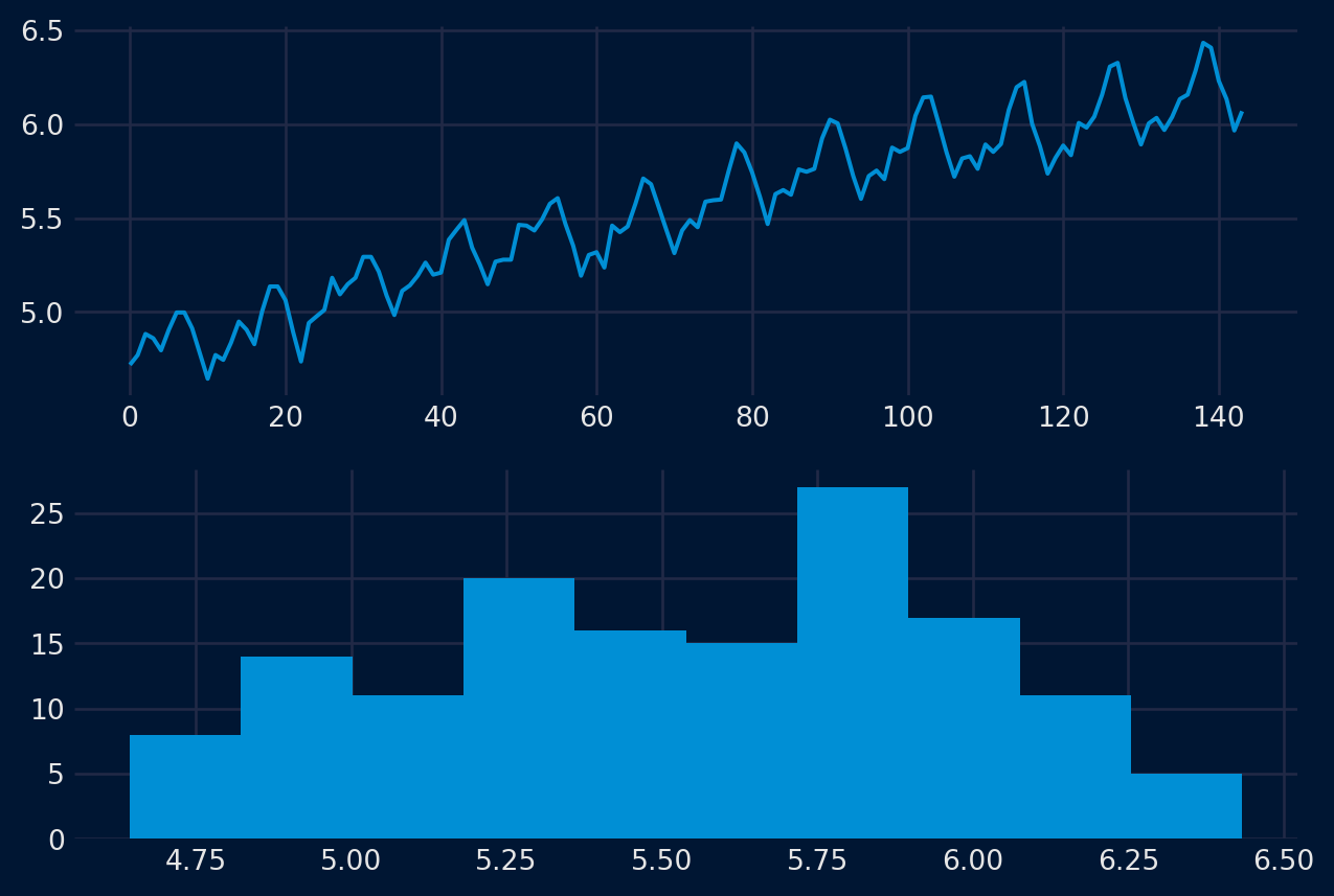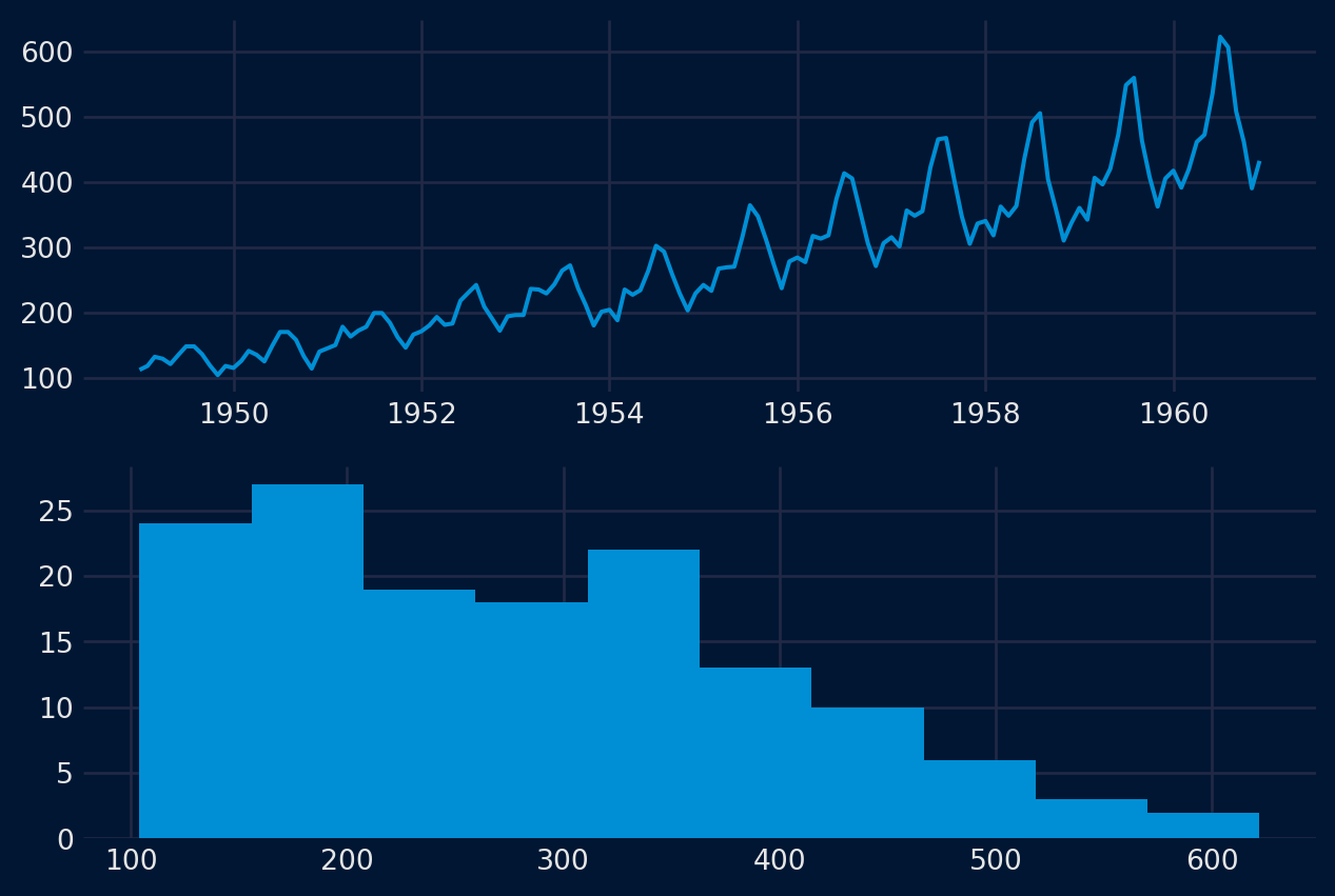 Otra visualización importante es la de la distribución de las propias observaciones. Es decir, un gráfico de los valores sin la ordenación temporal. Algunos métodos de previsión lineal de series temporales suponen que la distribución de las observaciones es correcta (es decir, una curva de campana o una distribución normal). Esto puede comprobarse explícitamente con herramientas como las pruebas de hipótesis estadísticas. Pero los gráficos pueden proporcionar una primera comprobación útil de la distribución de las observaciones, tanto en las observaciones brutas como después de realizar cualquier tipo de transformación de los datos.