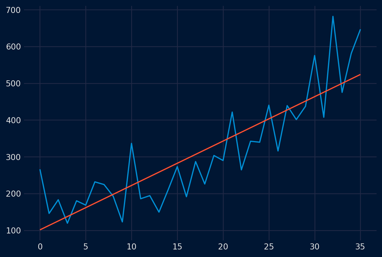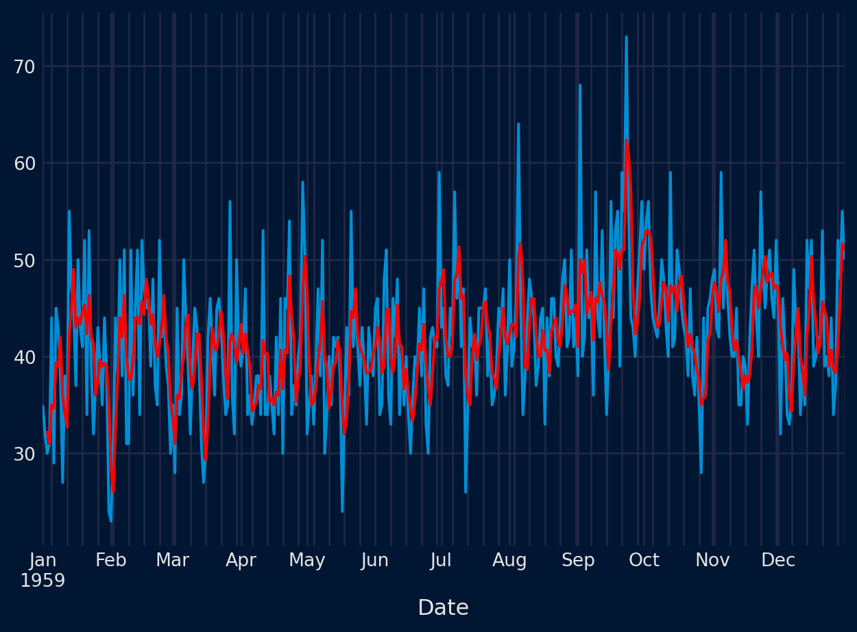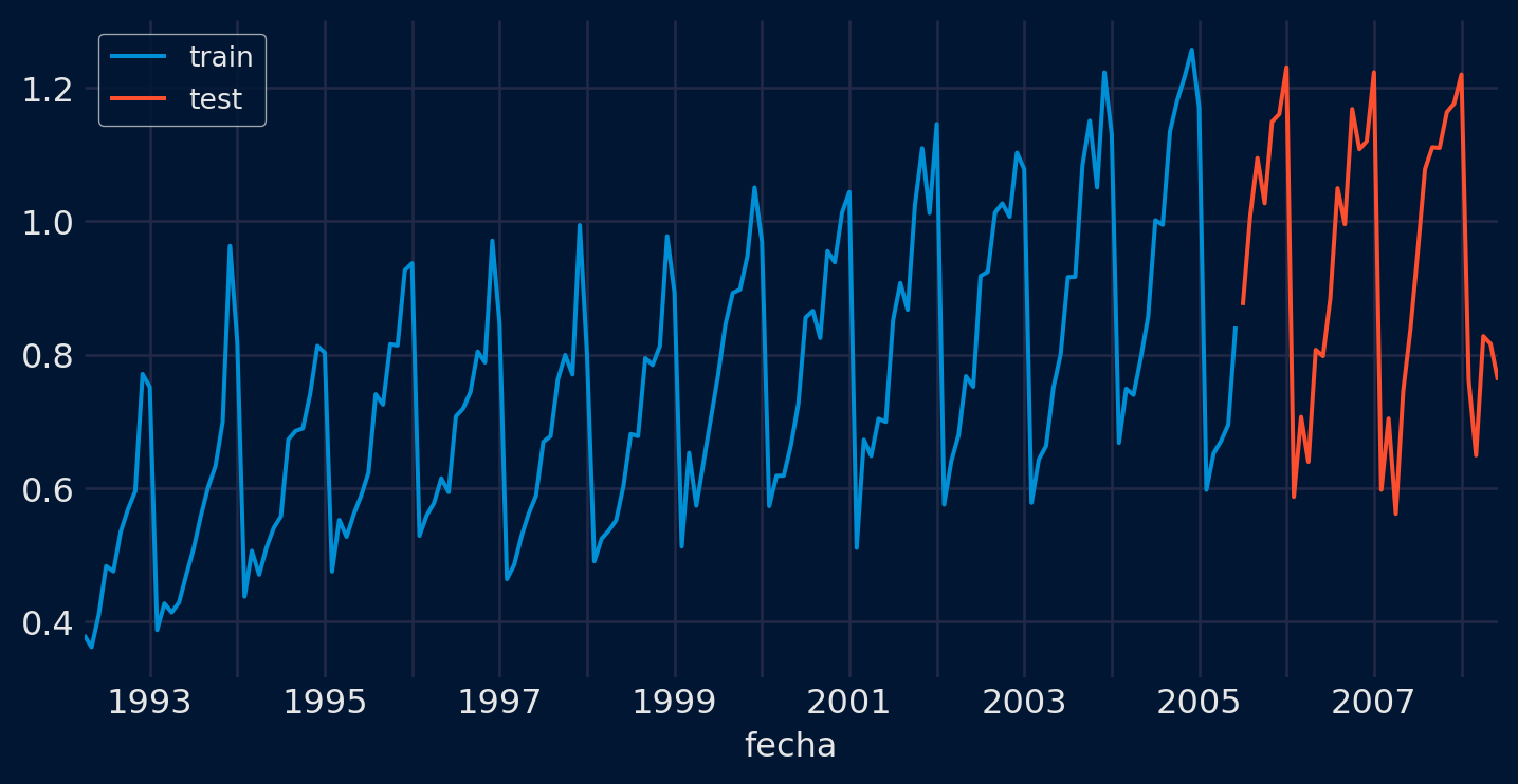 # Métrica custom # ==============================================================================def custom_metric(y_true, y_pred):''' Calcular el mean_absolute_error utilizando únicamente las predicciones de los últimos 3 meses del año. ''' mask = y_true.index.month.isin([10, 11, 12]) metric = mean_absolute_error(y_true[mask], y_pred[mask])return metric# Backtesting # ==============================================================================metrica, predicciones_backtest = backtesting_forecaster( forecaster = forecaster, y = datos['y'], cv = cv, metric = custom_metric, verbose =True )metrica