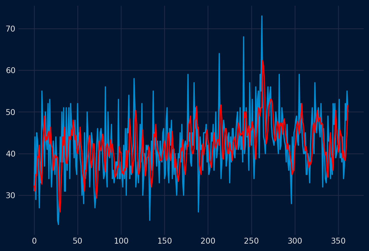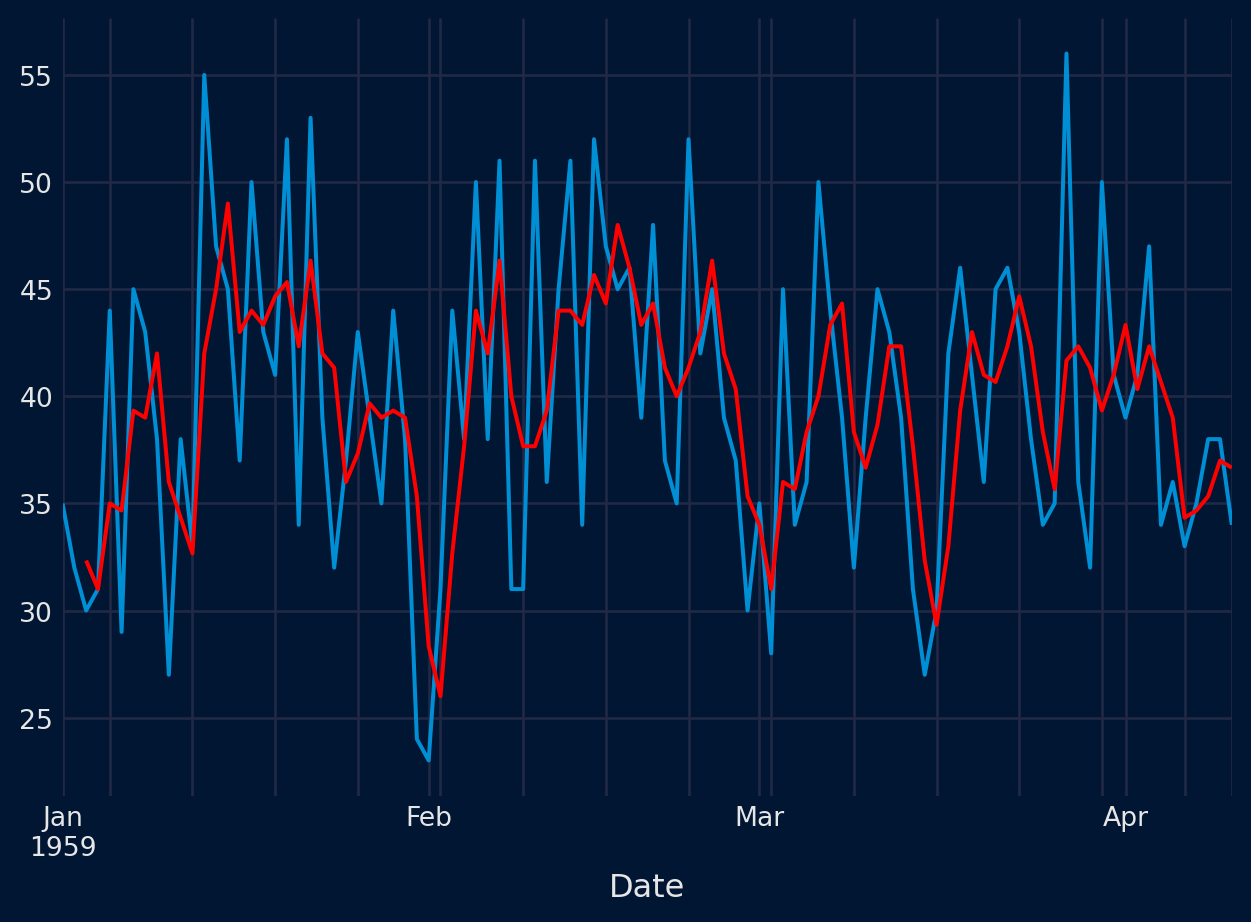 En determinados escenarios, puede ser interesante incorporar otras características de la serie temporal además de los lags, por ejemplo, la media movil de los últimos n valores puede servir para capturar la tendencia de la serie. El argumento window_features permite incorporar al modelo predictores adicionales, creados a partir de los valores pasados de la serie temporal.