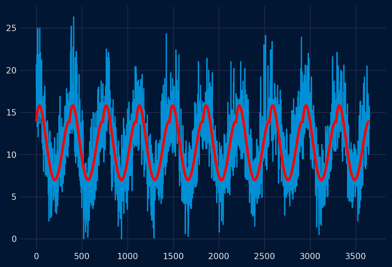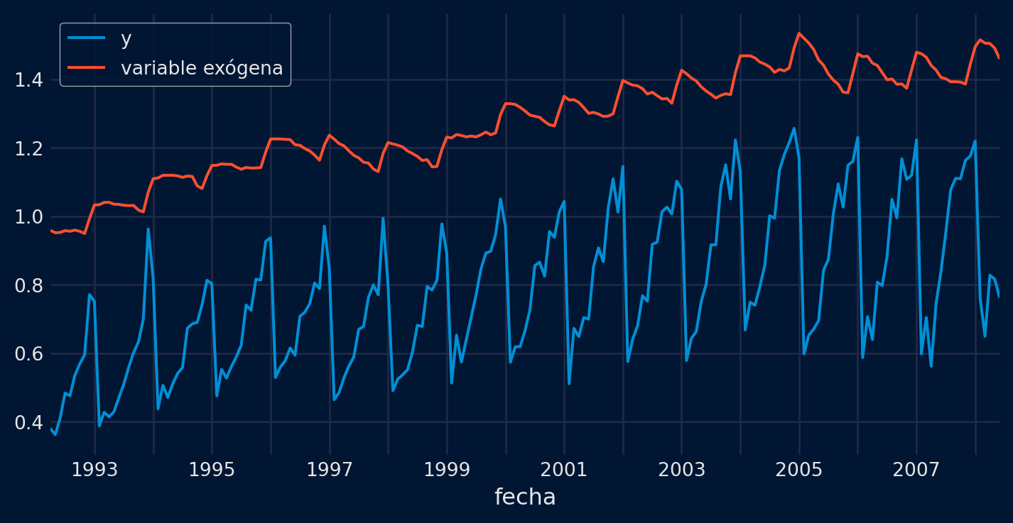 Siguiendo con el ejemplo anterior, se simula una nueva variable cuyo comportamiento está correlacionado con la serie temporal modelada y que, por lo tanto, se quiere incorporar como predictor. Esto mísmo es aplicable a múltiples variables exógenas.