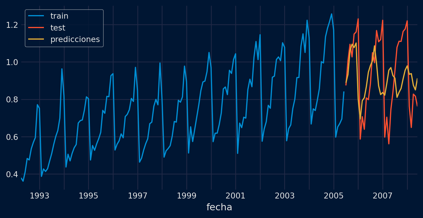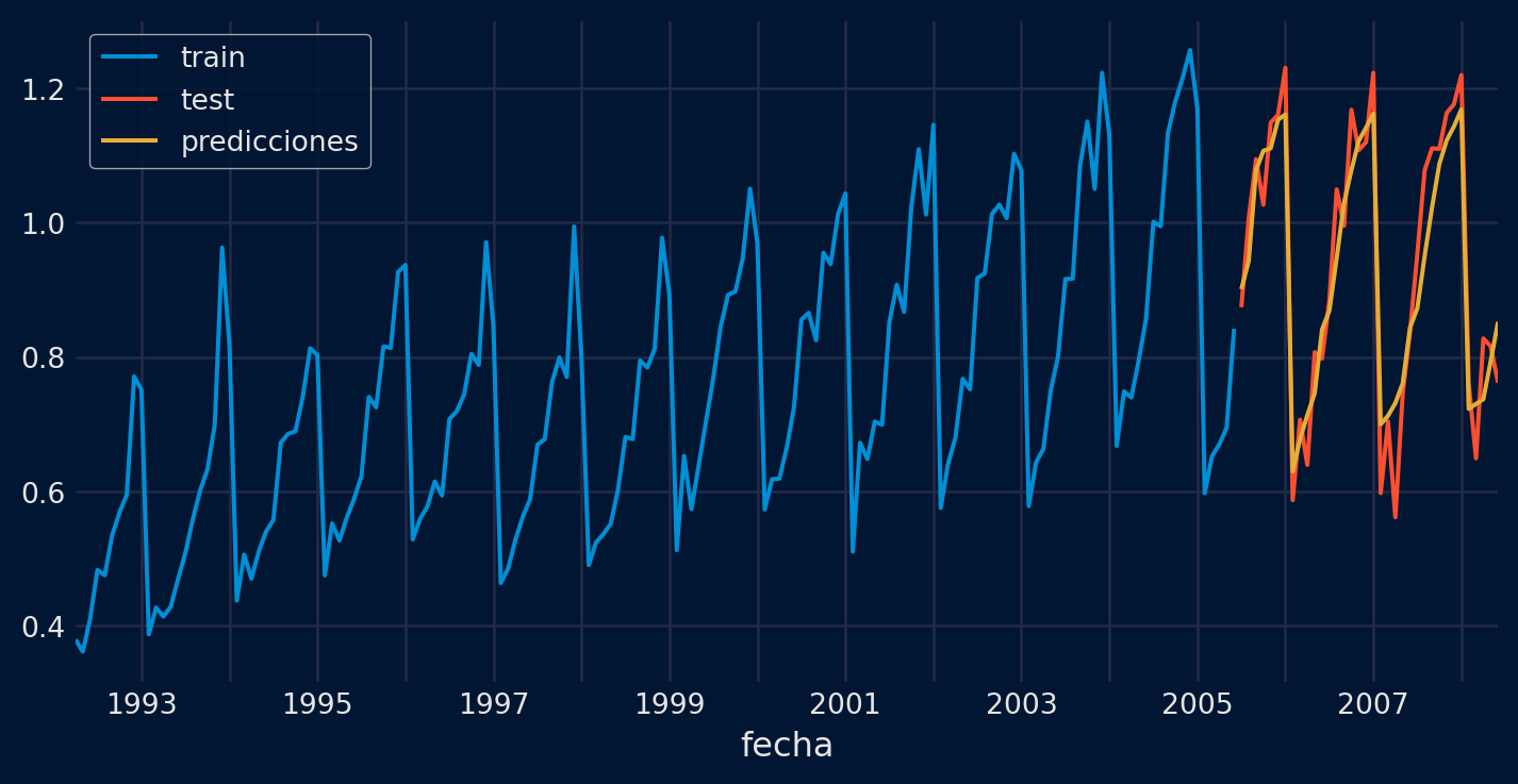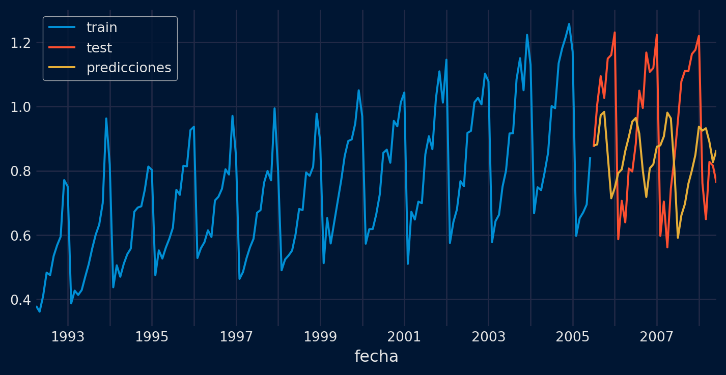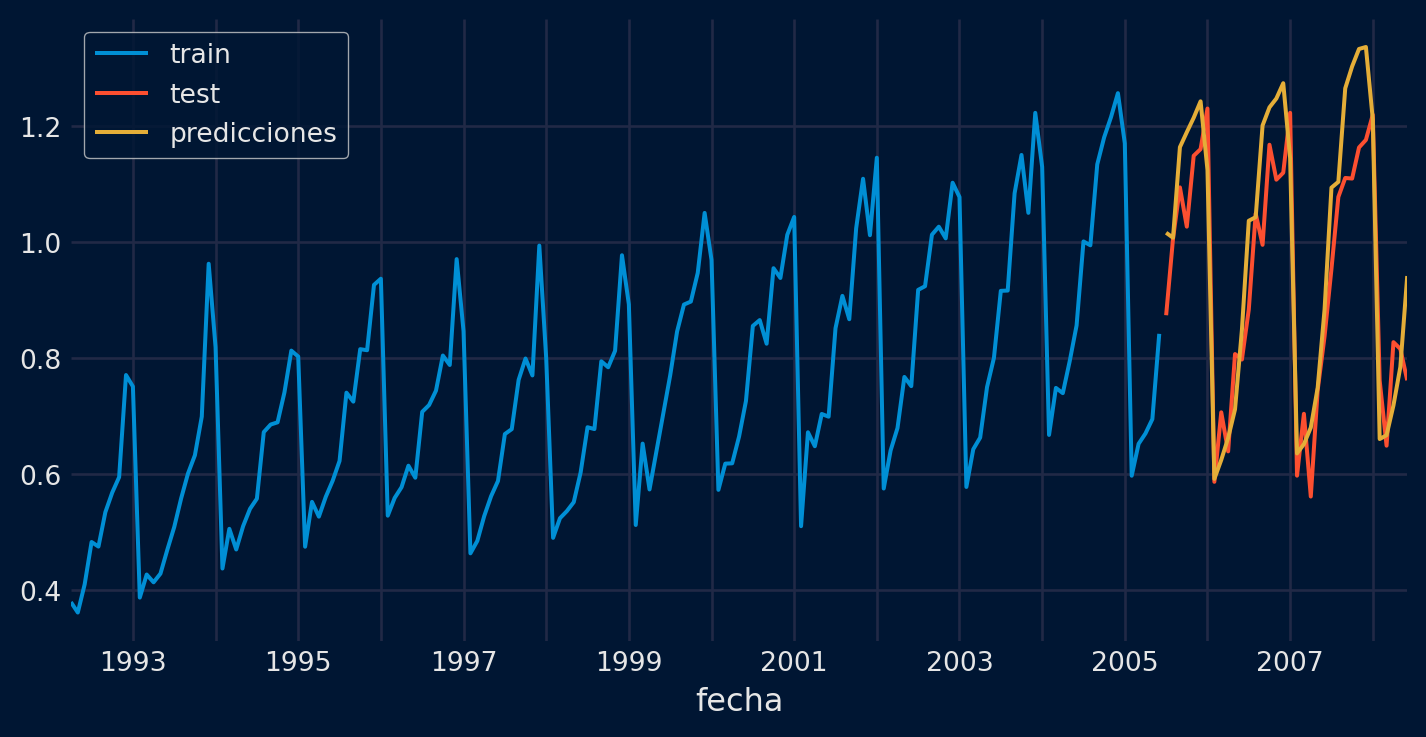 # Error test# ==============================================================================error_mse = mean_squared_error(y_true = datos_test['y'], y_pred = predicciones)print(f"Error de test (mse) {error_mse}")