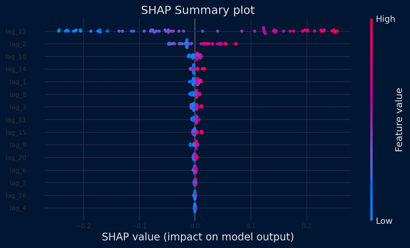 # Matrices de entrenamiento utilizadas por el forecaster para entrenar el regresor# ==============================================================================X_train, y_train = forecaster.create_train_X_y(y=datos_train['y'])# Crear SHAP explainer (para modelos basados en árboles)# ==============================================================================explainer = shap.TreeExplainer(forecaster.regressor)# Se selecciona una muestra del 50% de los datos para acelerar el cálculorng = np.random.default_rng(seed=785412)sample = rng.choice(X_train.index, size=int(len(X_train) *0.5), replace=False)X_train_sample = X_train.loc[sample, :]shap_values = explainer.shap_values(X_train_sample)# Shap summary plot (top 10)# ==============================================================================shap.initjs()shap.summary_plot(shap_values, X_train_sample, max_display=15, show=False)fig, ax = plt.gcf(), plt.gca()ax.set_title("SHAP Summary plot")ax.tick_params(labelsize=8)fig.set_size_inches(8, 4)plt.show()