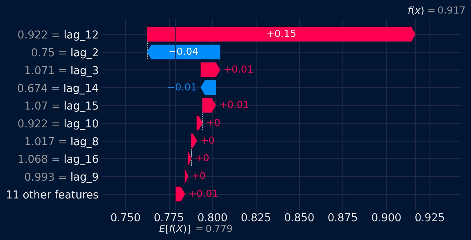 # Backtesting indicando que se devuelvan los predictores# ==============================================================================cv = TimeSeriesFold( steps =12*3, initial_train_size =len(datos) -12*9, fixed_train_size =False, refit =True, )_, predicciones_backtest = backtesting_forecaster( forecaster = forecaster, y = datos['y'], cv = cv, return_predictors =True, metric ='mean_squared_error', n_jobs =1 )predicciones_backtest.head()# Waterfall para una predicción concreta# ==============================================================================iloc_predicted_date = predicciones_backtest.index.get_loc('2005-04-01')shap_values_single = explainer(predicciones_backtest.iloc[:, 2:])shap.plots.waterfall(shap_values_single[iloc_predicted_date], show=False)fig, ax = plt.gcf(), plt.gca()fig.set_size_inches(7, 4)plt.show()
